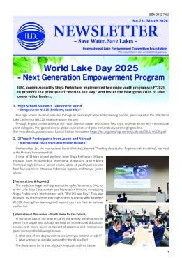 *The 20th World Lake Conference “Lakes as Sentinels for Integrated River Basin Management” *Report from Former JICA Training Participants (Cuba, Nicaragua, India and Bangladesh) *Highlights of Initiatives for Sustainable Lake Management in the 2024 Fiscal Year *Letter from Scientific Committee (Australia) *Our Activity Overview (FY2024) *Establishment of the United Nations Observance “World Lakes Day”
